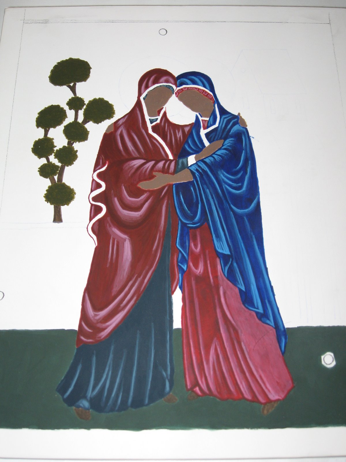 We need to move beyond the walls of fear that we construct in order to meet the other in friendship and in welcome. It is telling that the place of encounter between Mary and Elizabeth in this icon is outside the walls (this will become more apparent as the icon develops).