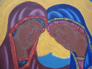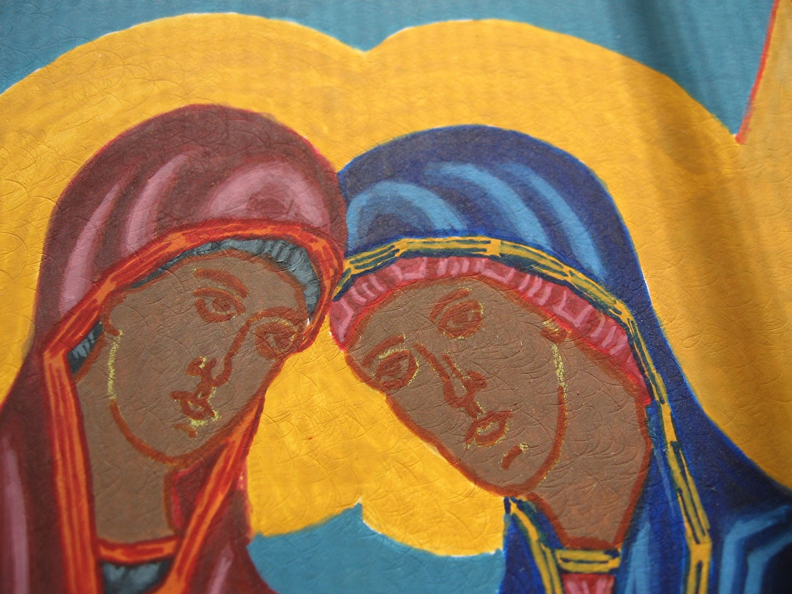 Here is a prayer experiment to help put the image in the context of our day. In prayer, imagine the setting not being what is found in the icon but the scene of a refugee settlement camp in one of the countries of Africa. Both Mary and Elizabeth’s skin is of a darker hue and they are members of a tribe forced to flee their country due to the threat of genocide. For weeks they have been separated from one another and finally (after searching non-stop) they find one another in the chaos of the camp. Imagine the joy and the love and the peace of that moment even as chaos and despair seem to swirl around them.