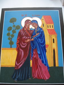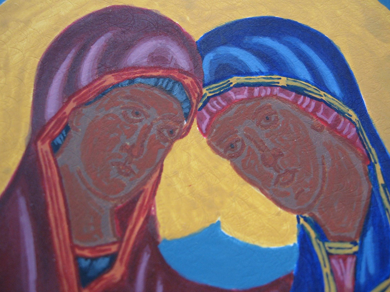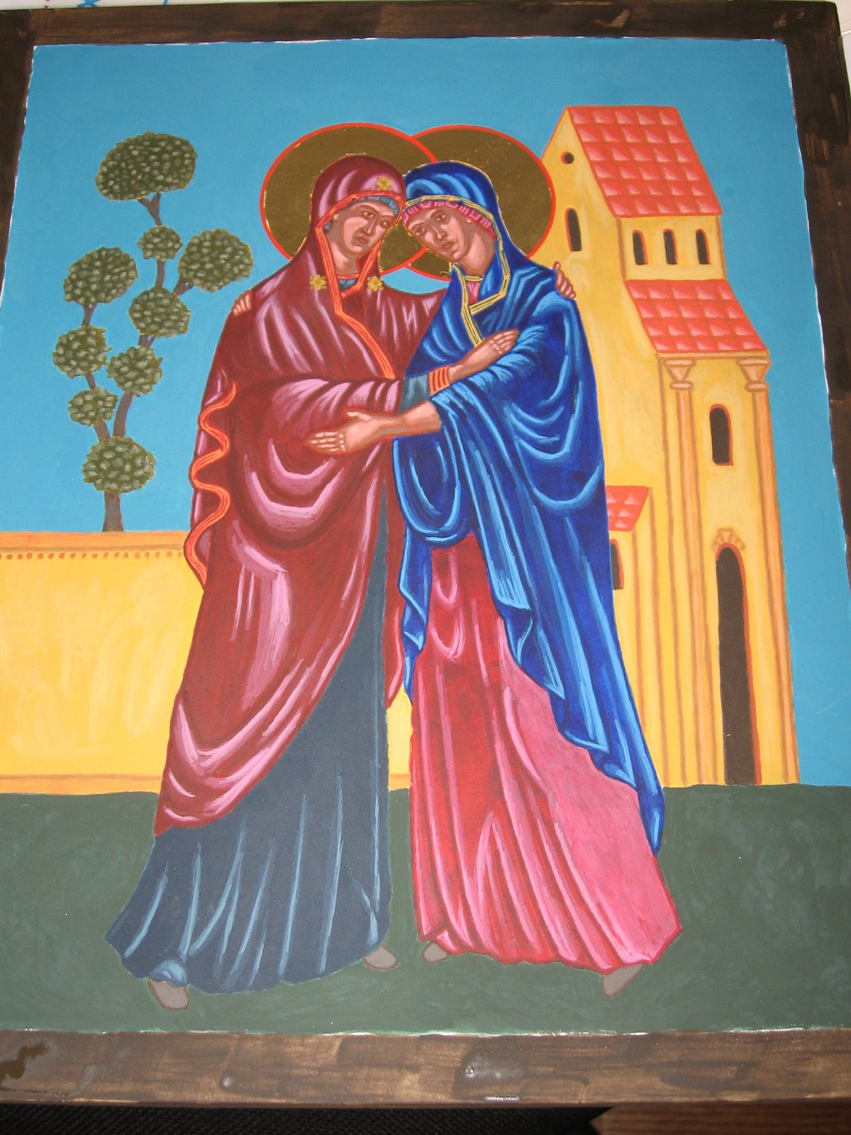 I have altered the icon from the original, not intentionally though. In the original icon – on Elizabeth’s left arm that embraces Mary there is a red sleeve. I did not notice this in the original image I copied from and left the sleeve out. Now Elizabeth’s arm is bare – the sleeve pushed up. I like this though. We “roll up” our sleeves when we are busy, when we have work to do. I can imagine Elizabeth busy about the work of the day when Mary arrives. Immediately this work is left behind as Elizabeth embraces her cousin in welcome!