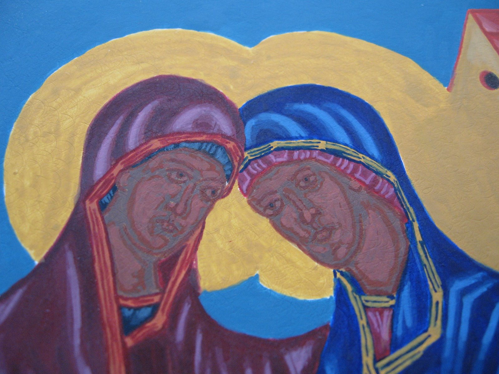 Through the process of writing this icon of the Visitation I have gained a different appreciation of this woman Elizabeth. Before, Elizabeth was just another name in the nativity story for me – a minor character in the background. Really though no one is ever minor in Scripture and when we focus our attention on these “minor characters” we quickly learn that they have some amazing truths to share. Elizabeth has shared some of her truths and has become a woman of deep and strong faith for me, unique in her interaction with the mother of our Lord. I wonder if this might be the real driving force behind the young Mary making the journey to visit her cousin.