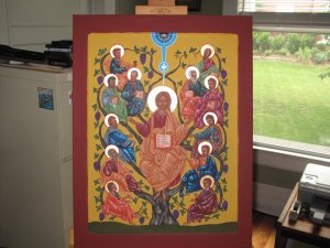 Christ surrounded by his apostles within the context of a “living tree” is, I believe, a wonderful image of Church. All is focused on Christ who is central and the branches strain toward heaven and the Father. The twelve apostles remind us of the apostolic nature of the Church – a mark of the Church often unreflected upon in our day. Christ retains the wounds of the crucifixion as the resurrection experiences recalled in scripture testify. Even in his glory Christ remains united to the suffering of his Church and all creation.